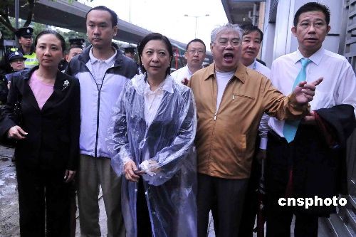 十一月三日,香港民建聯副主席蔣麗蕓(右三)及立法會議員黃定光(右二),與幾十名中小企的代表早上由遮打花園游行至政府總部,他們不滿銀行縮減信貸額,令營運資金緊絀,難以周轉。中新社發 譚達明 攝