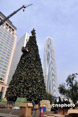 十一月十九日,香港工人正在港島中環(huán)地區(qū)裝巨型圣誕樹。香港特區(qū)旅發(fā)局今年覓得置地公司贊助,在皇后像廣場再亮起高三十米的圣誕樹,為香港繽紛冬日營造更好的節(jié)日氣氛。中新社發(fā) 譚達明 攝