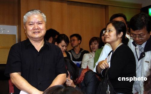 就前臺灣地區(qū)領(lǐng)導(dǎo)人陳水扁等人涉及“國務(wù)機要費”案、龍?zhí)顿彽匕浮⒛细壅褂[館案及洗錢案等四案,臺灣檢察機構(gòu)十二日偵查終結(jié),將陳水扁、吳淑珍等十四人分別依“貪污治罪條例”、偽造文書、違法“洗錢防制法”等罪名提起公訴。圖為“惜字如金”的“最高法院檢察署特別偵查組”發(fā)言人陳云南(左)在記者會前難得輕松與媒體問答。中新社發(fā) 劉舒凌 攝