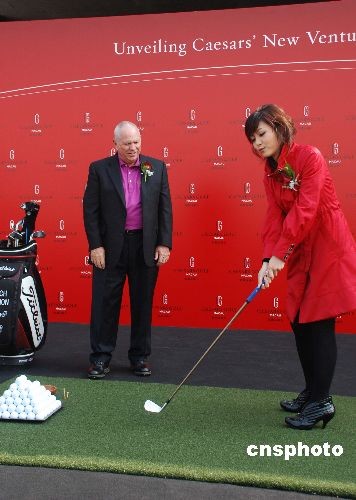 美國哈樂斯娛樂公司十二月十六日在澳門公布“凱撒高爾夫”發(fā)展計劃,包括開設亞洲首間布奇哈蒙高爾夫學校以及對現(xiàn)有高爾夫球場的提升改造。圖為著名高爾夫球教練布奇·哈蒙指導“澳門小姐”呂蓉茵揮桿動作。中新社發(fā) 畢永光 攝