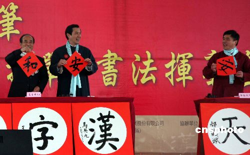 臺北市政府主辦的第五屆“漢字文化節”于二〇〇九年的第一天在臺北中央藝文公園舉行,吸引了一萬二千多民眾共揮毫迎新年。圖為臺灣地區領導人馬英九,臺灣立法機構負責人王金平和臺北市長郝龍斌等各界人士共同揮毫為新年祈福。中新社發 路梅 攝