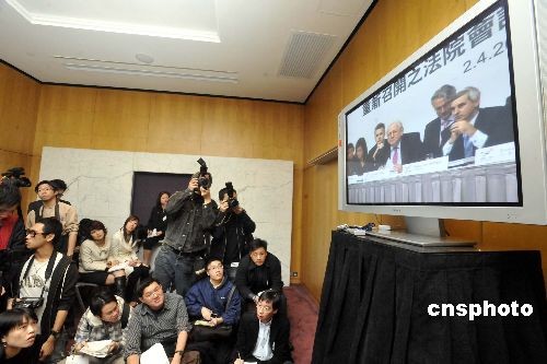 二月四日,電訊盈科在香港會議展覽中心舉行股東特別大會表決私有化議案。圖為媒體只能在會場外一個房間透過大會安排電視轉播關注場內會議情況。中新社發 鄧慶樂 攝