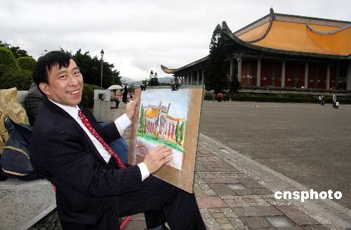 2月28日,應臺北故宮博物院邀請前來臺灣參訪的上海博物館館長陳燮君,在參觀臺北“國父紀念館”畫展后,忙里偷閑用隨身攜帶的畫具在紀念館前寫生。中新社發 陳立宇 攝