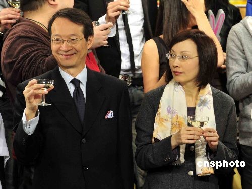 香港亞洲電視最近多個節目及宣傳片奪得殊榮,三月十七日,亞視特意舉行榮獲獎項祝捷會,新委任為行政總裁的胡競英與執行主席張永霖(左)一同分享獲獎的喜悅。中新社發 譚達明 攝