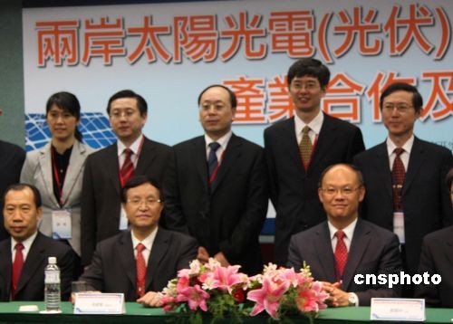 三月二十四日,發改委副主任張國寶以國家發改委能源所名譽所長的名義,率六十余人的代表團抵達臺灣出席“兩岸太陽光電產業合作及交流會議”。會議開幕前,張國寶率代表團主要成員與臺灣“經濟部”次長鄧振中在臺北合影。中新社發 耿軍 攝