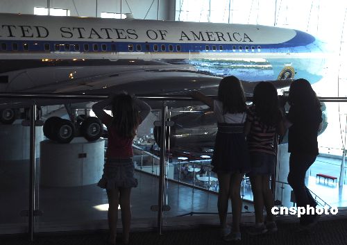 美國民眾十一月十九日參觀洛杉磯的里根總統(tǒng)博物館,大廳里展示當(dāng)年三任總統(tǒng)乘坐過的空軍一號專機和海軍一號直升機。中新社發(fā) 賈國榮 攝
