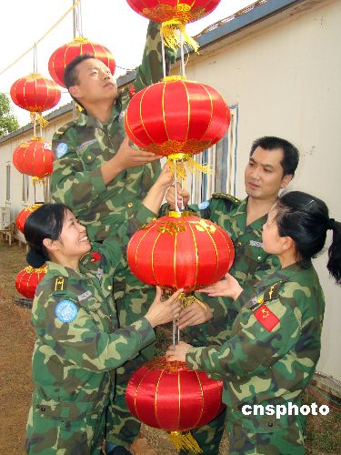 中國第三批赴蘇丹瓦烏維和部隊為使官兵在環境艱苦、條件惡劣的任務區度過一個祥和、愉快的春節,堅持以人為本,積極克服聯合國后勤供應不及時的困難,立足現有條件、因地制宜,科學安排,勤儉節約,較好地保證了在春節期間,官兵飲食有保障,過年有氛圍。中新社發 劉恩海 攝