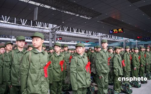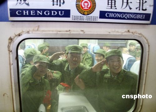 11月19日下午,重慶地區2008年冬季招兵征召的首批915名進藏新兵在重慶火車北站登上列車,前往成都受訓準備進藏服役。據稱,本次前往西藏服役的新兵8成以上達到高中以上文化程度,平均年齡為19歲,來自重慶大足、璧山、渝北等17個區縣。中新社發 郭晉嘉 攝