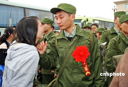 11月23日,四川眉山市首批奔赴西藏服役的新兵,告別家鄉(xiāng)踏上保衛(wèi)祖國的征程。在今年的冬季征兵中,作為地震災(zāi)區(qū)的眉山市廣大適齡青年,被來到當(dāng)?shù)貐⒓涌拐鹁葹?zāi)的英勇的部隊官兵所感動,紛紛報名應(yīng)征入伍,其中還有不少災(zāi)區(qū)青年和在災(zāi)區(qū)做志愿者的青年踴躍報名。中新社發(fā) 堯遙 攝