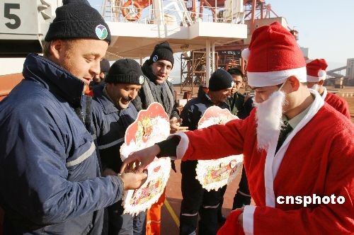 12月23日,江蘇公安邊防總隊連云港邊防檢查站的戰士扮成“圣誕老人”來到停泊在連云港口岸的外輪上,為外籍船員送去祝福和圣誕禮物,讓外籍船員在中國感受圣誕快樂。中新社發 王健民 攝