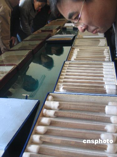 十月十八日,蘭州市民在甘肅簡牘展覽室欣賞兩千年前的漢簡。甘肅簡牘保護研究中心經批準成立,并于十月十八日揭牌,長期擠放于陰冷庫房里的萬枚珍貴簡牘正式宣告“換新房”。甘肅先后出土簡牘六萬余枚,尤以漢簡數量最多,現分別收藏于英國倫敦的大英圖書館、臺北南港歷史語言研究所和甘肅。因人員、經費原因,漢簡在甘肅保存條件很差,出現了變形損毀等嚴重情況。簡牘,是中華民族先民們對政治、軍事、經濟、社會、文化等活動的記錄。中新社發 殷春永 攝