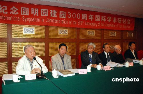 10月18日,中國圓明園學會主辦的“紀念圓明園建園300周年國際學術研討會”在北京召開。一百多名來自中國、法國、美國、意大利、韓國、日本等國的專家學者參加了會議。會議就圓明園所涉及的歷史、人文、園林、建筑、文物保護、考古挖掘及利用和開發等多學科發表學術觀點,展開國際學術交流。圖為會議現場,建筑學家、兩院院士吳良鏞(左一)發言談圓明園的保護和利用。中新社發 李學仕 攝