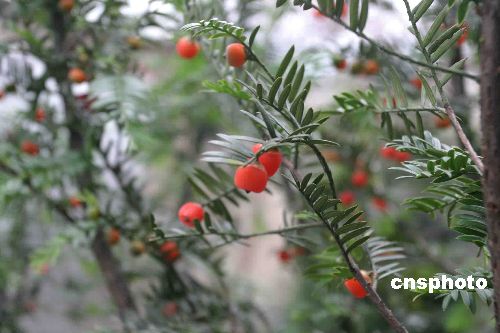 10月中旬,浙江桐廬瑤琳鎮(zhèn)姚村杭州桐廬瑤琳紅豆杉有限公司基地的一株紅豆杉樹開花結(jié)果,果實達(dá)500余顆。據(jù)介紹,這株紅豆杉樹6年前從外地引進(jìn)。背景資料:紅豆杉,又稱紫杉,也稱赤柏松,屬常綠喬木,由于在自然條件下紅豆杉生長速度緩慢,再生能力差。由于紅豆杉的提取物紫杉醇具有獨特的抗癌機(jī)理,被認(rèn)為是對多種癌癥療效好、副作用小的新型抗癌藥物,上世紀(jì)80年代末90年代初以來,中國的野生紅豆杉,在短短的十幾年中遭到毀滅性砍伐和破壞,野生存量銳減。中國林業(yè)部1992年將其列為一級珍貴保護(hù)樹種。中新社發(fā) 何小華 攝