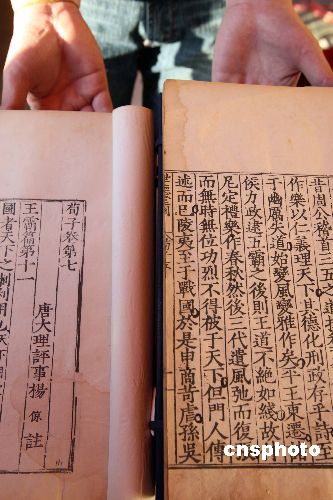 北京地壇秋季書市十一月上旬正在火爆進(jìn)行中,今年亮點(diǎn)之一的舊書淘寶一條街,成為許多酷愛古舊圖書的“書蟲”光顧最多的去處。圖為價值十余萬的明嘉靖世德堂刻印——《荀子二十卷》亮相北京秋季書市。中新社發(fā) 任海霞 攝