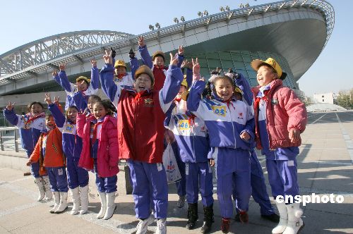 十一月十七日,來自北京回龍觀新龍小學的農民工子女,興致勃勃地參觀了北京理工大學體育館暨08年奧運排球比賽場館。中新社發 張勤 攝