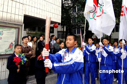 十一月二十二日,一名手持北京奧運會“祥云”火炬的中學生火炬手步入福州第十九中學校園。當日距北京奧運會開幕還有二百六十天,由國際奧委會奧林匹克珍藏品中國巡展組委會主辦的北京奧運會“祥云”火炬進福州校園活動在福州實驗小學、福州第十九中學校園舉行。中新社發 劉可耕 攝