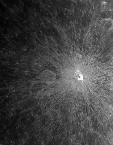 中國國家航天局今天向媒體發布信息說,“嫦娥一號”衛星CCD相機已對月球背面進行成像探測,并獲取了月球背面部分區域的影像圖。此圖顯示的是月球背面Lents撞擊坑附近一個典型的輻射線撞擊形貌,坑緣直徑約30km,從撞擊坑中心放射狀拋射大量高亮物質(根據區域地質背景,應該為基性斜長巖碎屑),該類撞擊坑形成年代通常較晚。本圖是由5軌CCD正視影像數據拼接而成的,數據獲取時間為2007年12月4日。