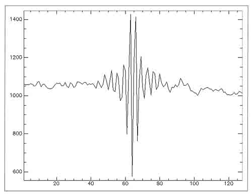 圖2、干涉曲線(橫軸為干涉曲線采樣點數,縱軸為灰度值,本圖是圖1從左到右第65列對應的干涉曲線)