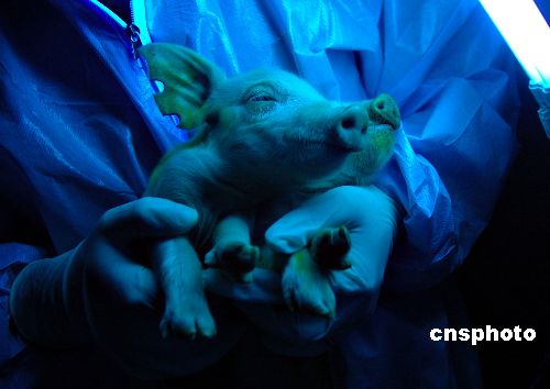 2008年1月7日12時,在哈爾濱三元畜產實業有限公司,11頭小豬順利降生,其中2頭表現出明顯綠色熒光蛋白特征。當日,東北農業大學傳出喜訊,由該校劉忠華教授主持的中國首例綠色熒光蛋白轉基因克隆豬當上“媽媽”,出生的11頭新生小豬其中有6頭為公豬,5頭為母豬,均健康活潑。中新社發 姚庭山 攝