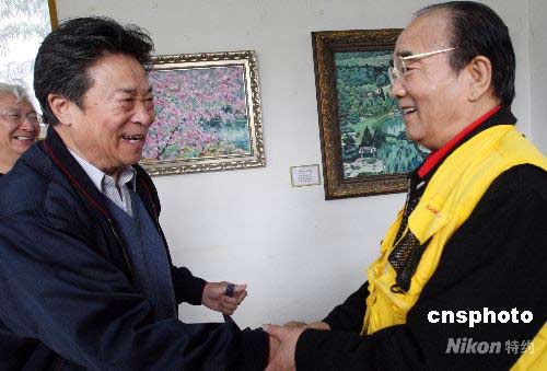 4月15日,以北京植物園景觀為專題的“王石之油畫展”在植物園盆景園內開幕,是次畫展是由曾畫毛澤東巨像的中國著名畫家王石之創作完成,展出的40幅油畫都是以一畫一景的形式從植物園的春天到冬天不同季節,不同區域的自然風光、園林美景、人文古跡等優美景觀。圖為李光曦(左)與高占祥出席開幕式。中新社發 錢興強 攝