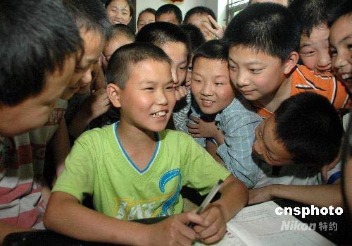 5月25日,來自四川綿陽市火炬實驗小學(xué)學(xué)生藍宇高興地開始了在河北省新樂市孝德小學(xué)的學(xué)習(xí)生活。地震發(fā)生后,藍宇來到新樂市赤垢村的姨媽家。經(jīng)聯(lián)系,孝德小學(xué)校領(lǐng)導(dǎo)高度重視,決定收留藍宇,免除其全部費用,并提供藍宇的生活費用。中新社發(fā) 賈敏杰 攝