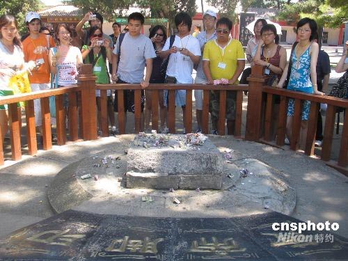 七月六日,英國優(yōu)秀華裔青少年夏令營拜謁黃帝陵。圖為營員門在參觀“黃帝腳印石”。中新社發(fā) 冽瑋 攝