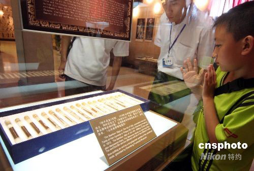 7月23日,北京中國軍事博物館舉行的“制勝之道——《孫子兵法》”展上,20片刻有《孫子兵法》的竹簡以特殊形態亮相。為保護這些竹簡,每片竹簡都保存在一個裝滿藥水的密閉管中。據介紹,這些竹簡是從3個不同墓坑中發掘的。中新社發 吳芒子 攝