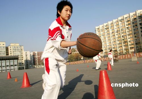 11月21日,北京中學生在體育課上積極練習籃球運球往返跑,應對中考體育考試科目變化。近日,2009年中考體育方案出臺,明年中考體育總分仍為30分,并將首次實現全市統(tǒng)一考試項目、統(tǒng)一成績評定標準、統(tǒng)一考試規(guī)程和統(tǒng)一考試時間的“四統(tǒng)一”。在考試項目上,男女生都必考的立定跳遠將就此退出中考,取而代之的是繞標志物15米往返籃球運球。中新社發(fā) 富田 攝
