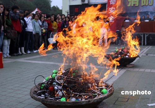 為汲取上海商學(xué)院“11.14”重大火災(zāi)事故教訓(xùn),11月22日上午,湖北三峽大學(xué)舉行了消防安全宣傳活動。組織學(xué)校師生開展了滅火逃生疏散演練,現(xiàn)場還對收繳的1000余支“熱得快”進(jìn)行銷毀,提高師生的消防安全意識。中新社發(fā) 方佩 攝