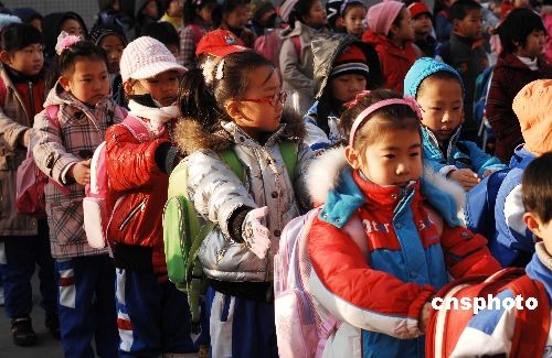 3月2日早,大連鵬輝小學(xué)的學(xué)生們?cè)诓賵隽嘘?duì)。當(dāng)日,寒假過后,遼寧大連市中小學(xué)2008-2009學(xué)年度第二學(xué)期開學(xué)上課。中新社發(fā) 劉德斌 攝