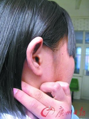 昨天下午,記者在廣州市中西醫(yī)結(jié)合醫(yī)院見到了小晴,她看上去精神有些恍惚,面部微腫,腹部有輕微皮外傷。醫(yī)生為她檢查了耳部后,診斷為“耳膜穿孔,嚴(yán)重程度中等”。