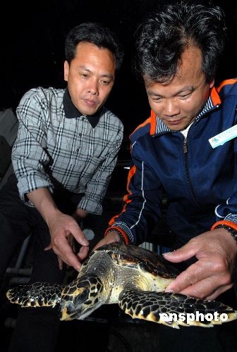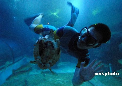 4月13日,福州一漁民將其幾天前在海邊偶然發現的“玳!焙}斔瓦M福州左海海底世界。這只“玳瑁”長約12厘米,重約1750克,嘴如鷹嘴,甲殼為褐色,頜緣鋸齒狀。據飼養員介紹,這只小海龜大約才2歲,還屬于“嬰兒”狀態!扮殍!庇址Q十三鱗,屬于國家二級保護動物,一般壽命可達1500歲,成年的玳瑁(約20多歲)身長1米,體重40~60公斤,主要生長于熱帶及亞熱帶地區的暖水性海洋。該類海龜在中國主要分布于臺灣、福建和海南等沿海一帶海域。 中新社發 穆長梓 攝