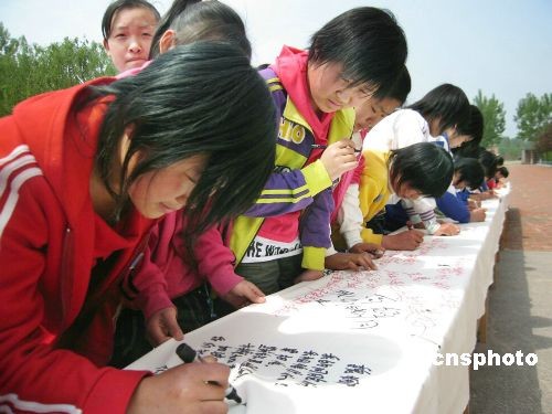 在“五一二”汶川大地震一周年之際,山東省陽信縣翟王中學(xué)的學(xué)生自發(fā)舉辦了以“銘記·力量·明天”為主題的紀(jì)念大地震一周年活動(dòng)。一千二百多名中學(xué)生紛紛在長五十一點(diǎn)二米、寬一點(diǎn)五米的長卷上簽名留下祝福話語,表達(dá)對(duì)四川大地震災(zāi)區(qū)人民的關(guān)切之情。中新社發(fā) 林世軍 攝