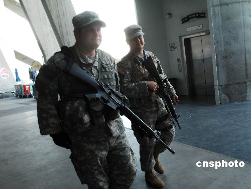 全副武裝的士兵在聖地牙哥高通體育館臨時避難場巡邏。