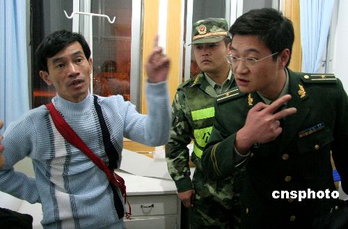 在醫院,當地警方向獲救船上的醫生(左一)了解情況。