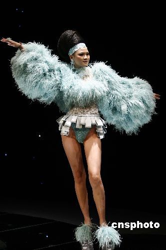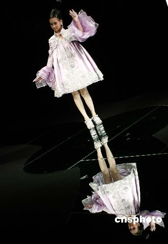 十一月三日晚,在北京舉行的2007年中國國際時裝周的舞臺上,模特在夢幻般的舞臺上展示設計師華麗的作品。中新社發 盛佳鵬 攝