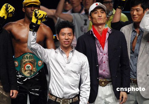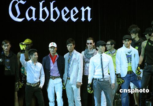 11月4日晚,正在北京舉行的中國國際時裝周08春夏系列活動,卡賓男裝發布會現場別具匠心地擺出拳擊臺,以彰顯表現激情個性的生活態度主題。卡賓服飾中國有限公司藝術總監卡賓,一向信奉“顛覆流行,方能創造時尚”的設計哲學,他的服裝秀形式變化多端。中新社發 錢興強 攝