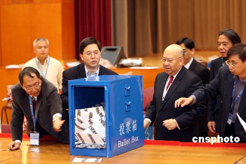 12月2日深夜,香港政制及內地事務局局長林瑞林[左二]、香港選舉管理委員會主席彭鍵基法官[右]到社區綜合大樓點票站視察點票情況。此次香港立法會港島區補選共有八名候選人競逐一個議席,分別是:柳玉成、李永健、蕭思江、葉劉淑儀、蔣志偉、凌尉云、陳方安生、以及何來。