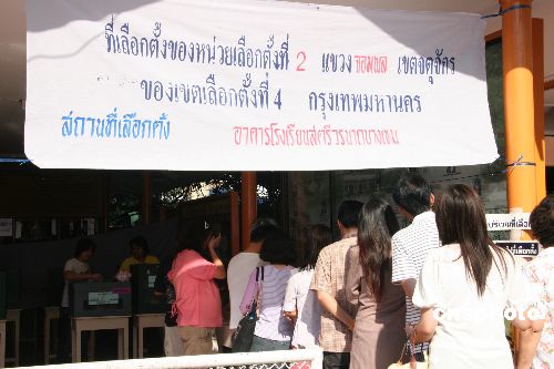 圖為設在曼谷拉察喲庭路的一個投票點,選民在排隊踴躍投票。