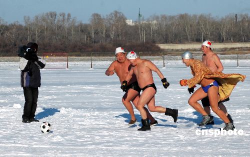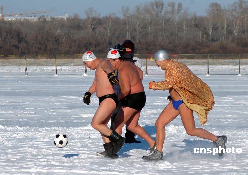 12月23日,50余名中俄邊城的冬泳愛好者在黑龍江上進行冬泳和足球比賽,用挑戰自我的方式迎接新年的到來。中新社發 邱齊龍 攝