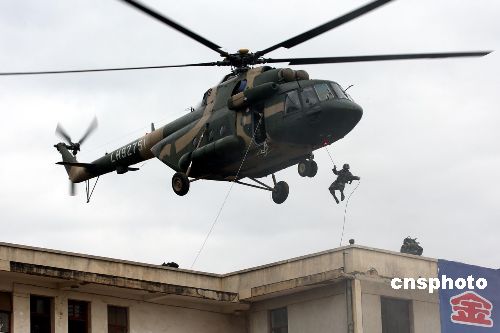 圖為訓練中,中印參演軍人乘武裝直升機垂直進入演練地域。