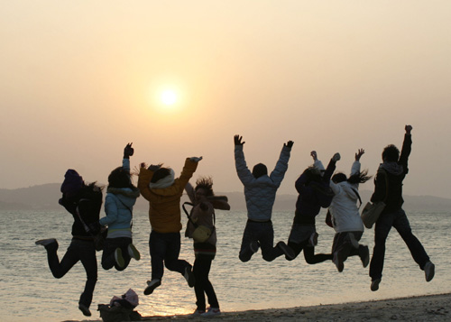 臺(tái)灣地區(qū)2007年最后一道夕陽(yáng),十二月三十一日出現(xiàn)在金門,古寧頭慈堤外,青年追日族興奮揮別落霞,準(zhǔn)備迎接新一年到來(lái)。(“中央社”圖;倪國(guó)炎攝)