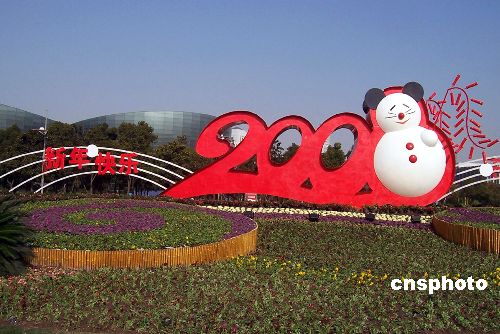 12月31日。上海浦東世紀(jì)廣場(chǎng)的上萬(wàn)盆鮮花和大型“2008”賀年牌及其中那白色的“8”字“雪鼠”別致造型,迎接2008年到來(lái)。中新社發(fā) 周東潮 攝