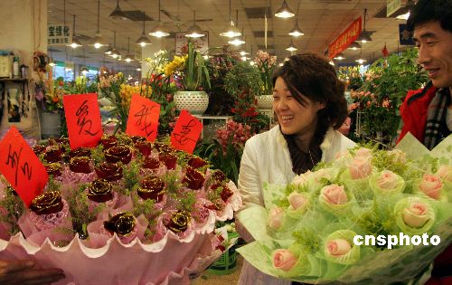 二月十三日,形形色色的口彩玫瑰亮相上海情人節(jié)花市。圖為逛花市的女性面對(duì)由五十七朵玫瑰組成的諧音“吾愛(ài)我妻”口彩玫瑰開(kāi)心不已。中新社發(fā) 潘索菲 攝