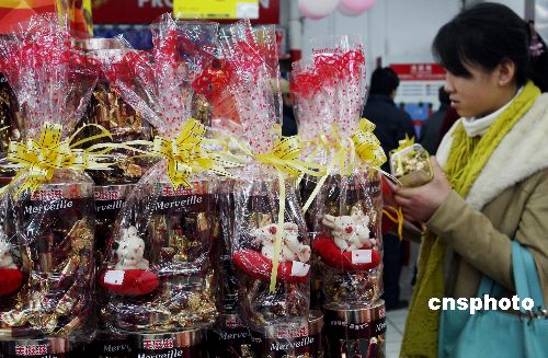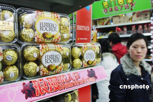 2月13日,西方情人節前夕,巧克力銷售成為北京各大商場的“重頭戲”,品種繁多的巧克力在各大商場占據最醒目的位置。中新社發 鄭雄增 攝