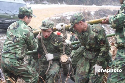 2月17日,成都軍區某紅軍師高炮團士兵增援貴州省黔東南電網建設,他們緊急投入到110千伏天錦輸電線路的搶修,力爭在2月21日通電。2月15日,成都軍區某紅軍師高炮團500名增援官兵馳援抵達貴州省黔東南苗族侗族自治州凱里市,他們將分赴黔東南州的三穗、天柱、錦屏、黎平等4縣受災點進行增援,晝夜搶修受損電網,以盡快恢復災區供電。中新社發 姚瑤 攝