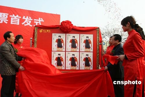 2月23日,《京劇凈角》曹操特種郵票在河南許昌首發(fā)。《京劇凈角》特種郵票一套6枚,為徐彥昭、包拯、廉頗、張飛、曹操、楊延嗣6位人物的京劇傳統(tǒng)劇目典型形象,此套郵票是繼《京劇生角》、《京劇旦角》、《京劇丑角》特種郵票之后發(fā)行的最后一套京劇題材類郵票。這套郵票的發(fā)行,將對弘揚(yáng)傳統(tǒng)文化、振興京劇藝術(shù)起到推動(dòng)作用。 中新社發(fā) 牛書培 攝