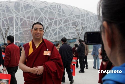三月十二日下午,部分全國政協(xié)委員參觀北京奧運場館。圖為全國政協(xié)委員、青海省佛教協(xié)會副會長拉茂賽赤活佛,在北京奧運會國家體育場“鳥巢”前請人拍照留影。中新社發(fā) 潘索菲 攝
