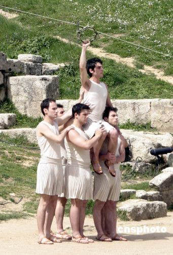 五名男祭司用橄欖枝編成的圓環組成了奧林匹克五環的形狀。