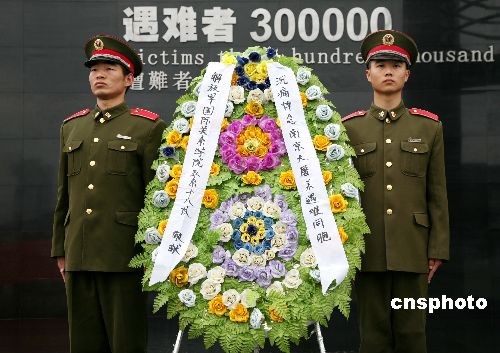 3月30日,解放軍戰士向南京大屠殺遇難同胞敬獻花圈。清明節臨近,眾多南京市民和外地游客來到侵華日軍南京大屠殺遇難同胞紀念館,以各種方式吊唁遇難同胞。中新社發 鐘山 攝